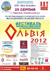25-26 августа 2012 года на территории Национального историко-археологического заповедника «Ольвия» на берегу Днепро-Бугского лимана в поселке Парутино, Очаковского района, Николаевской области и на базе отдыха "Волошская коса" состоится VIII Международный фестиваль авторской песни, греческой культуры и туристического отдыха «Ольвия-2012». Фестиваль проходит под Патронатом Николаевской областной государственной администрации и при поддержке кандидата в народные депутаты Украины Владимира Наконечного.