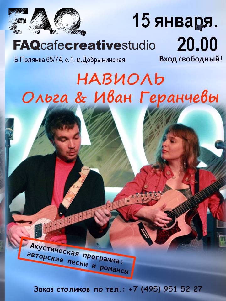 Акустическая программа "авторские песни и романсы" дуэта Ольги и Ивана Геранчевых 15 января в 20.00 в клубе FAQ-cafe (м. Добрынинская, ул.Б.Полянка 65/74) . Вход свободный Страница коллектива http://vk.com/geranchevi